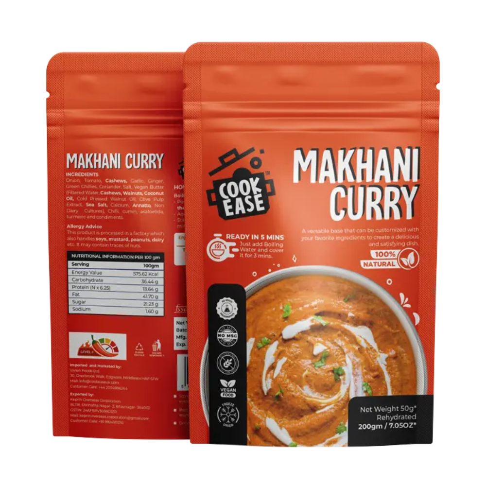 Onion, Tomato, Cashews, Garlic, Ginger, Green Chillies, Coriander, Salt, Vegan Butter (Filtered Water, Cashews, Walnuts, Coconut Oil, Cold Pressed Walnut Oil, Olive Pulp Extract, Sea Salt, Calcium, Annatto, Non-Dairy Cultures), Chilli, Cumin, Asafoetida, Turmeric, Blended Spices.